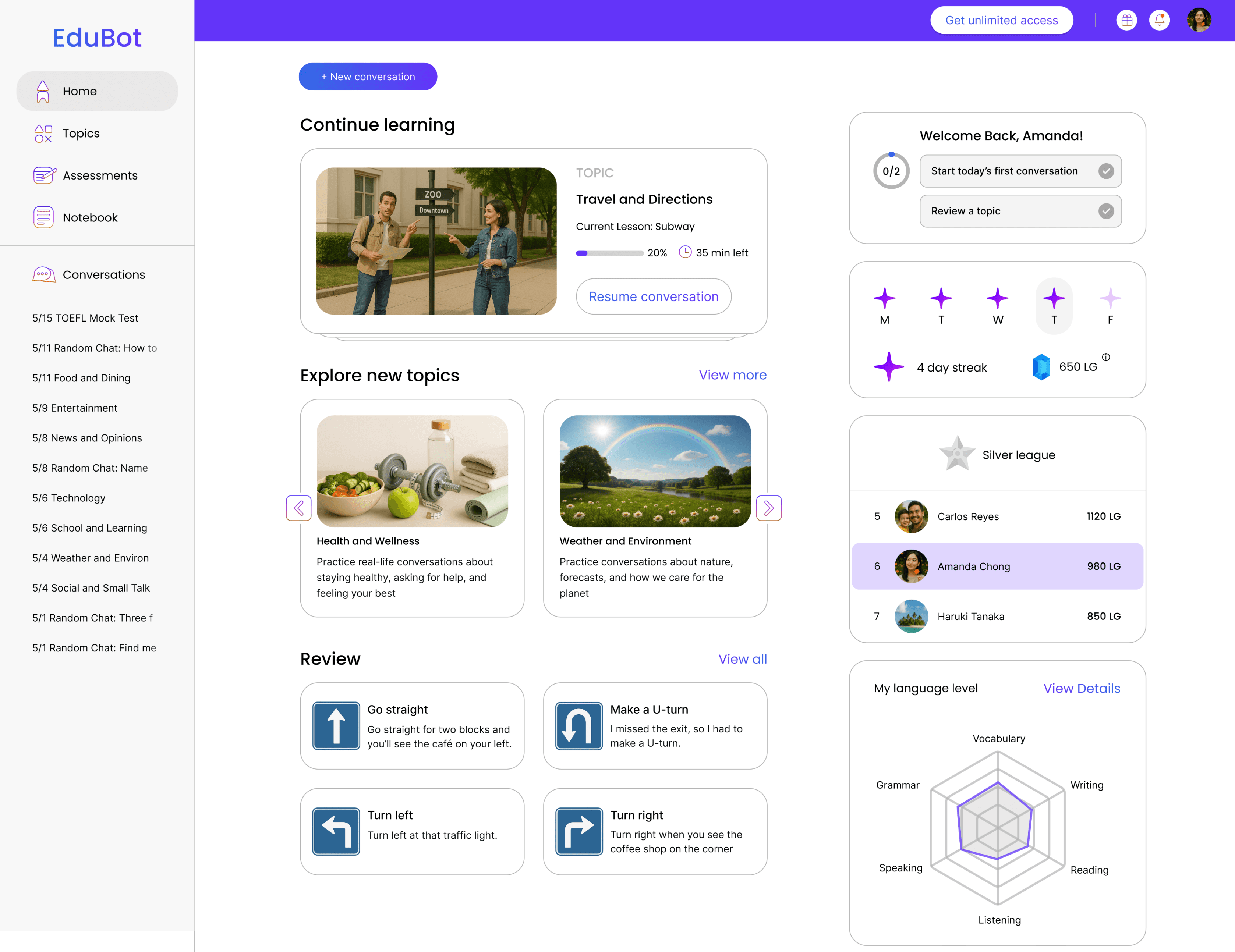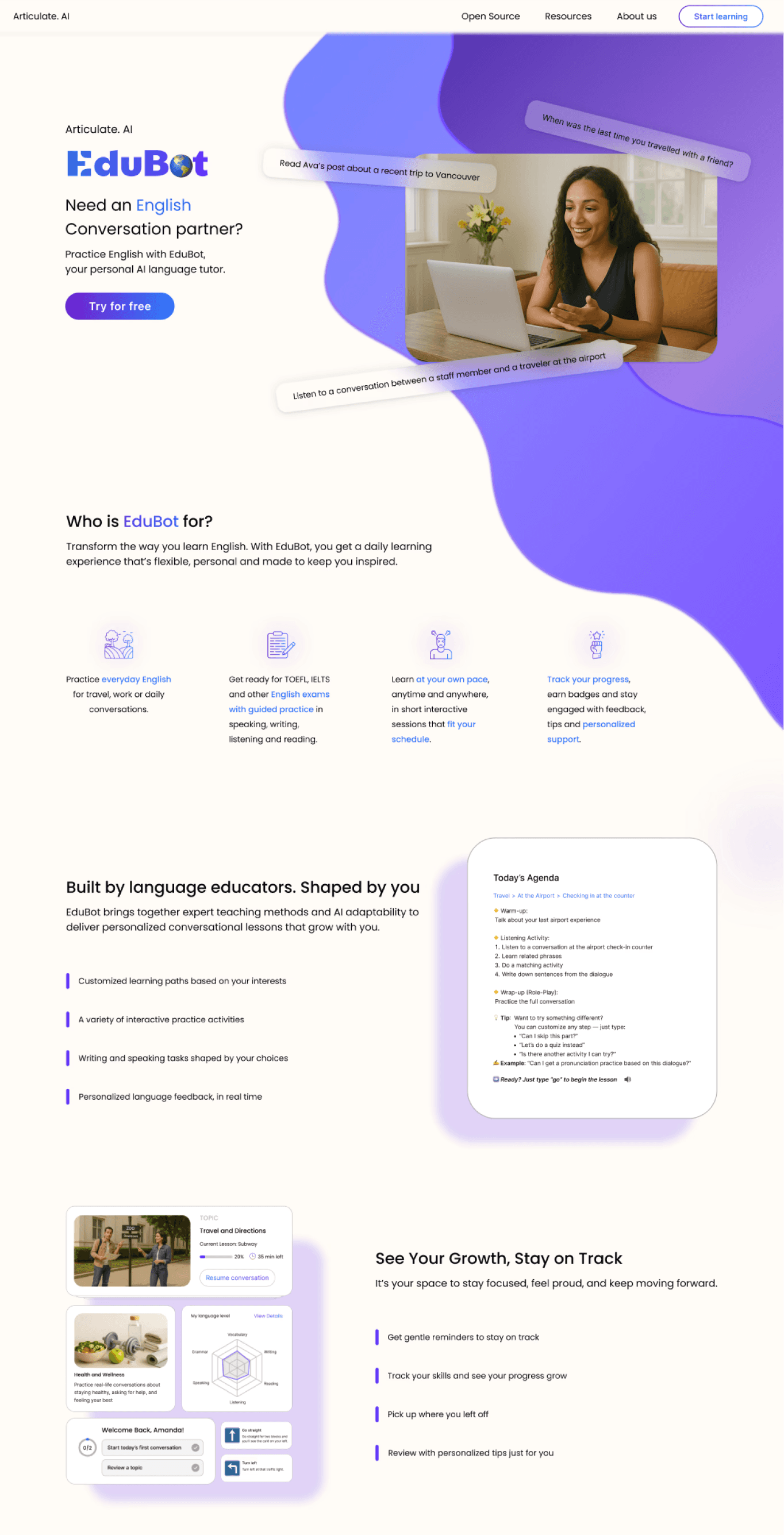 An AI-powered English learning chatbot for non-native speakers, providing personalized support from general proficiency to standardized test prep through conversational AI and scaffolded learning pathways.