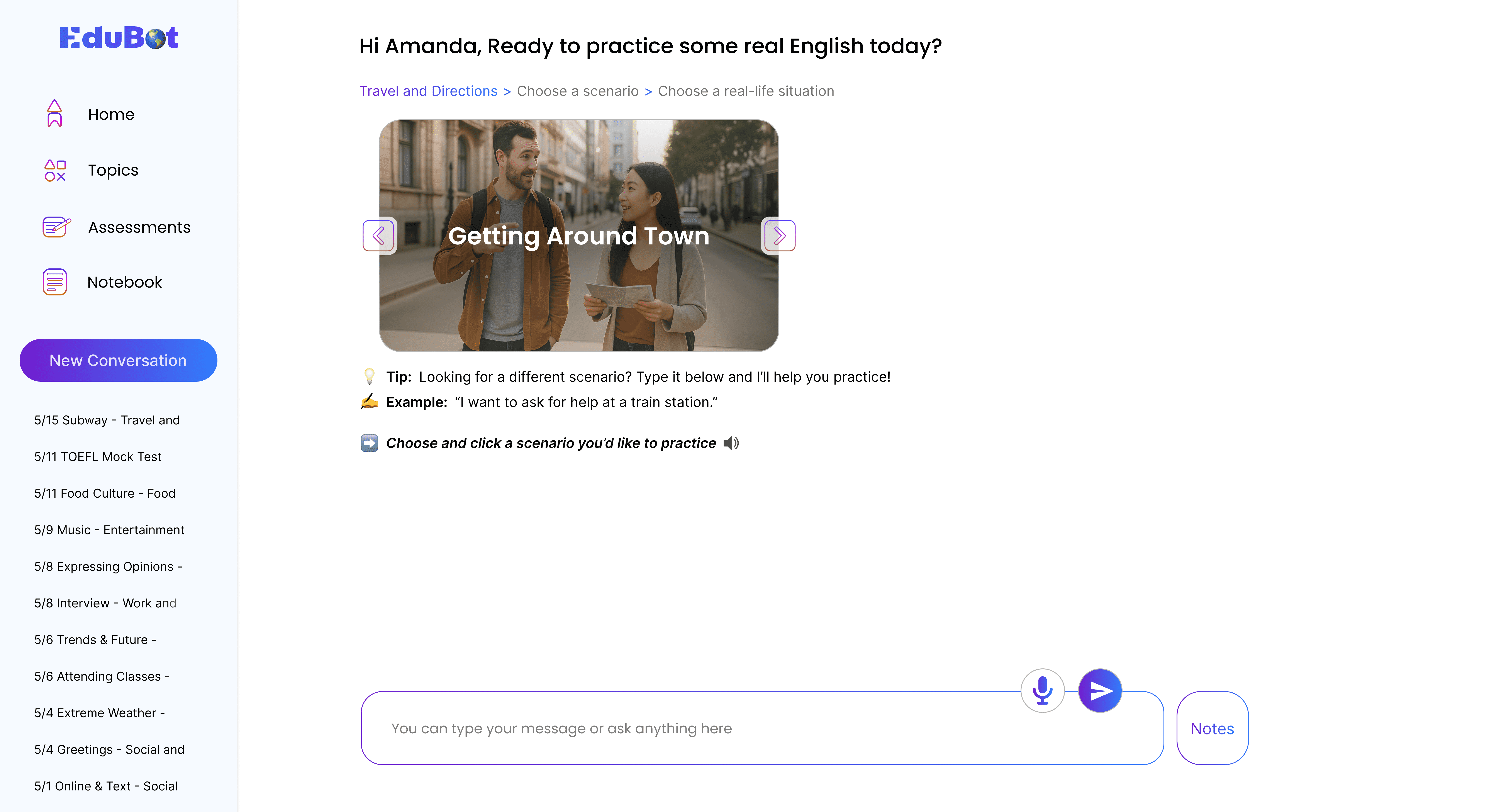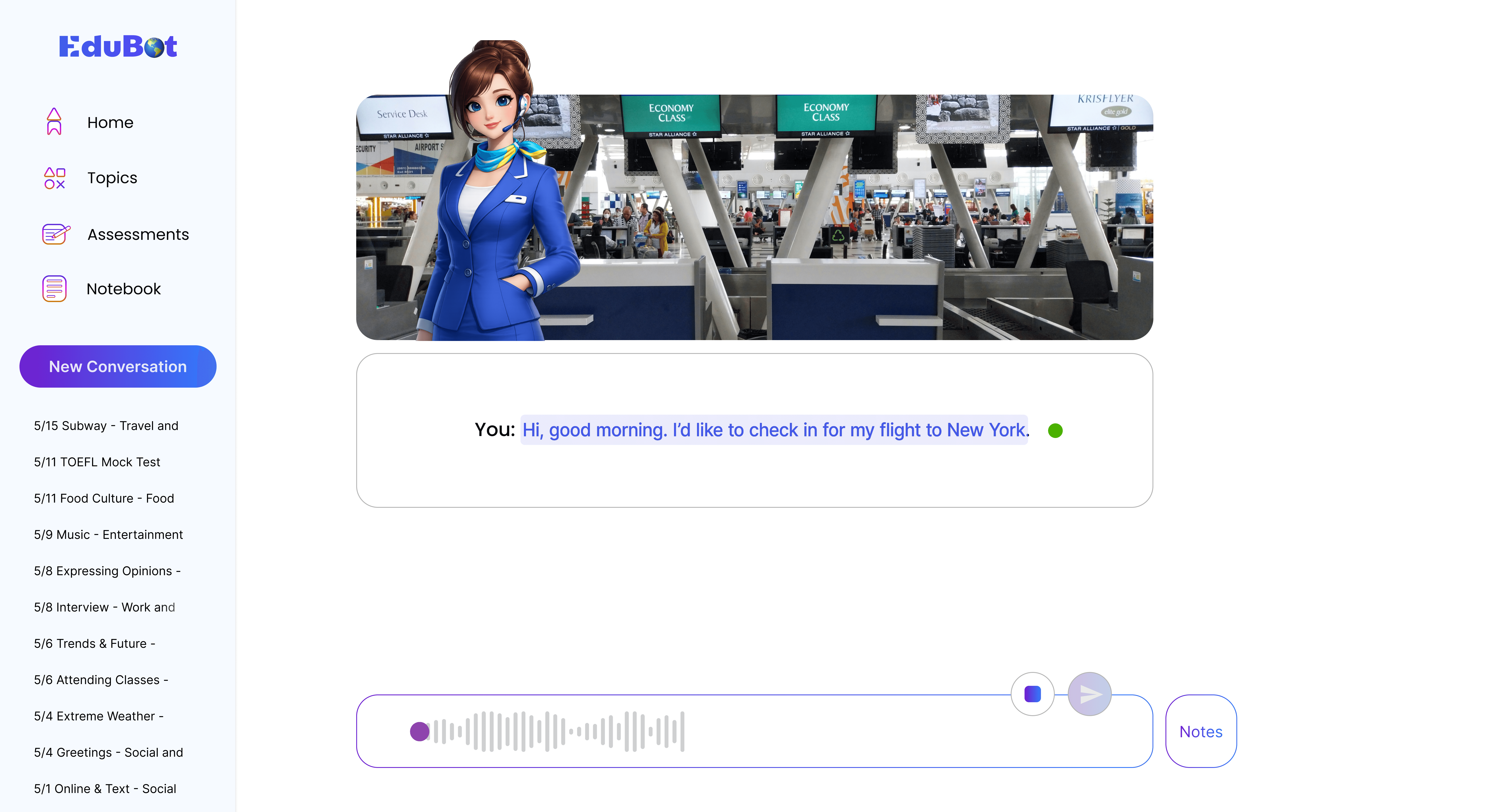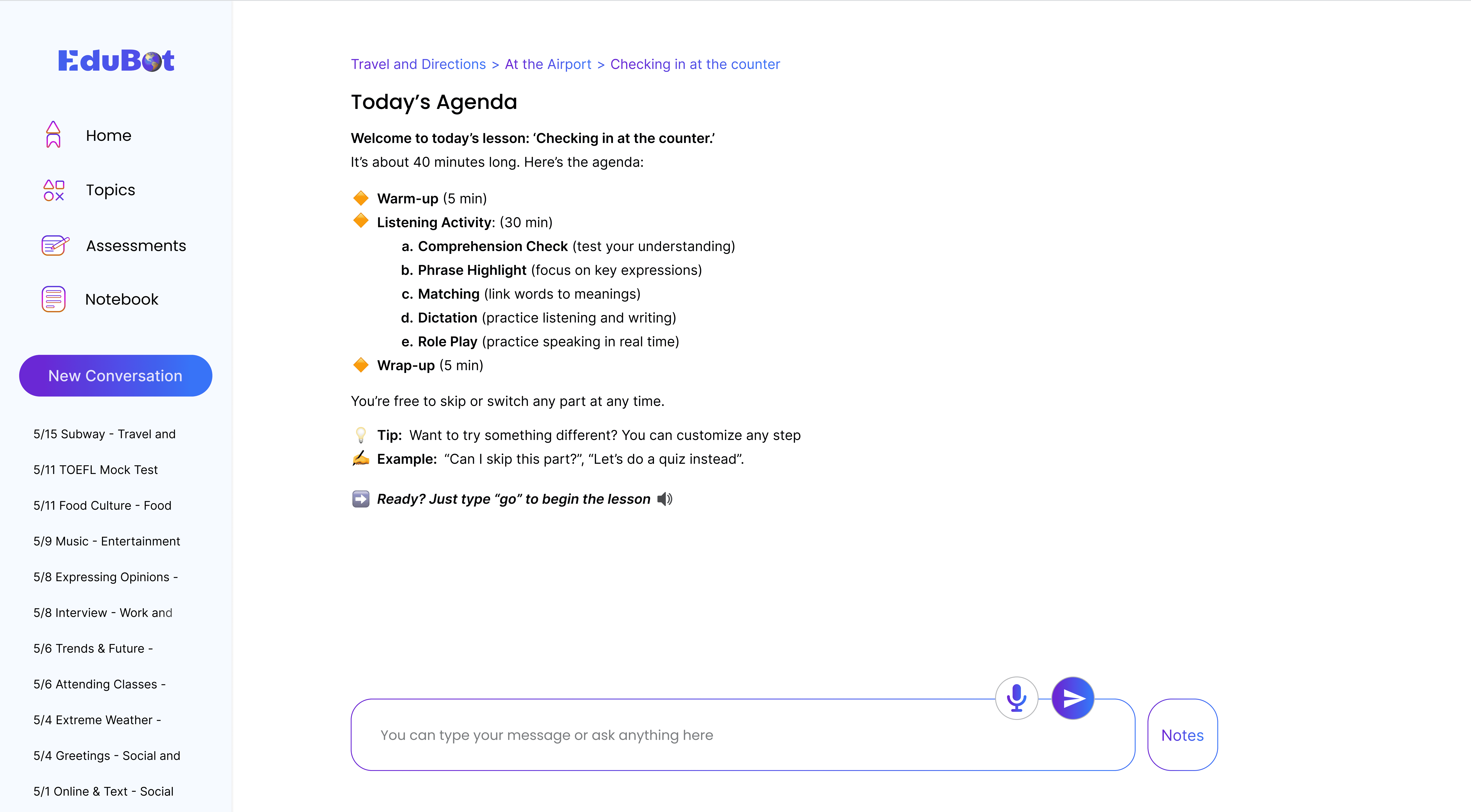 After exploring a scenario through listening and vocabulary activities, learners complete a speaking role-play with EduBot to simulate real conversations and get targeted feedback on pronunciation and fluency.
