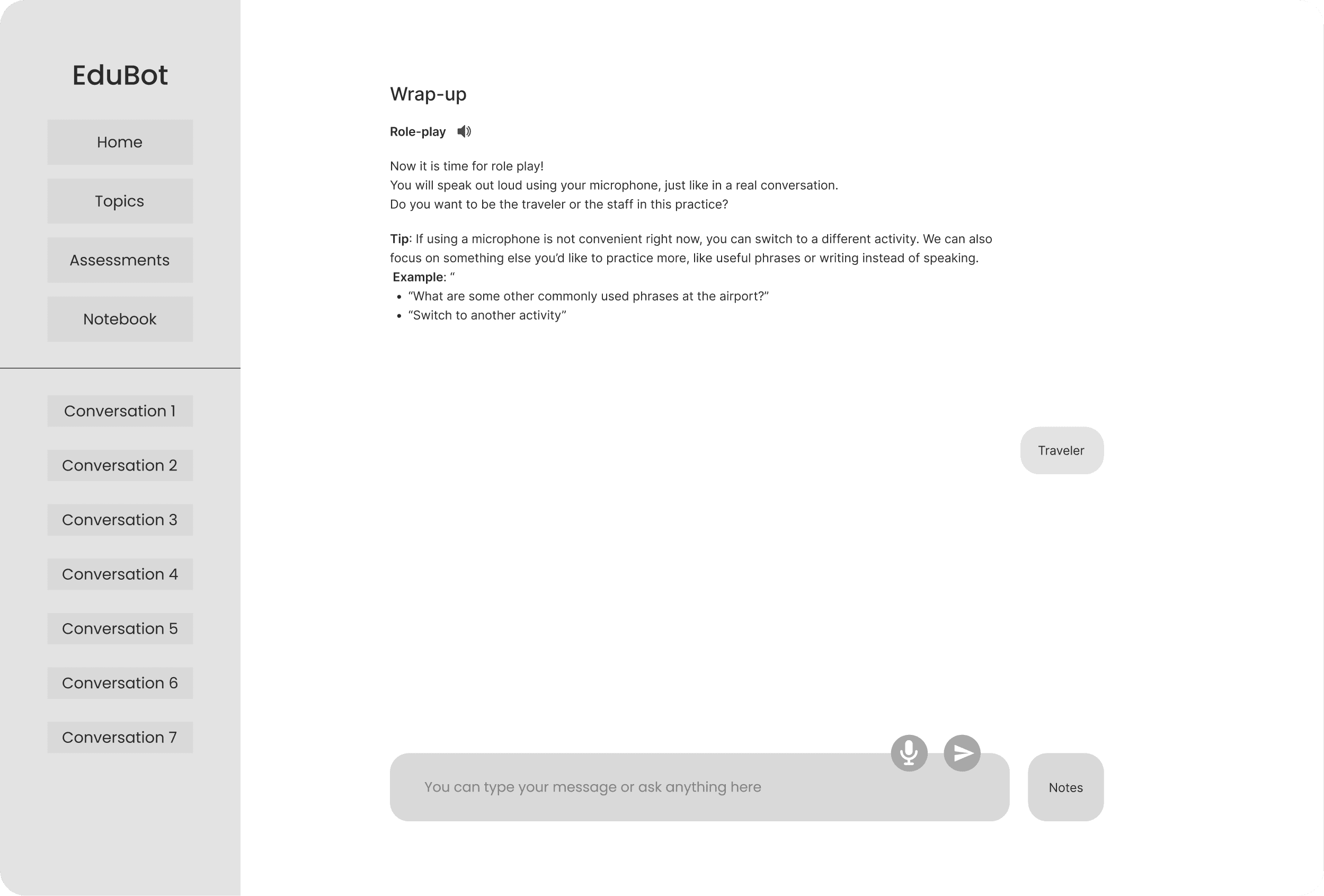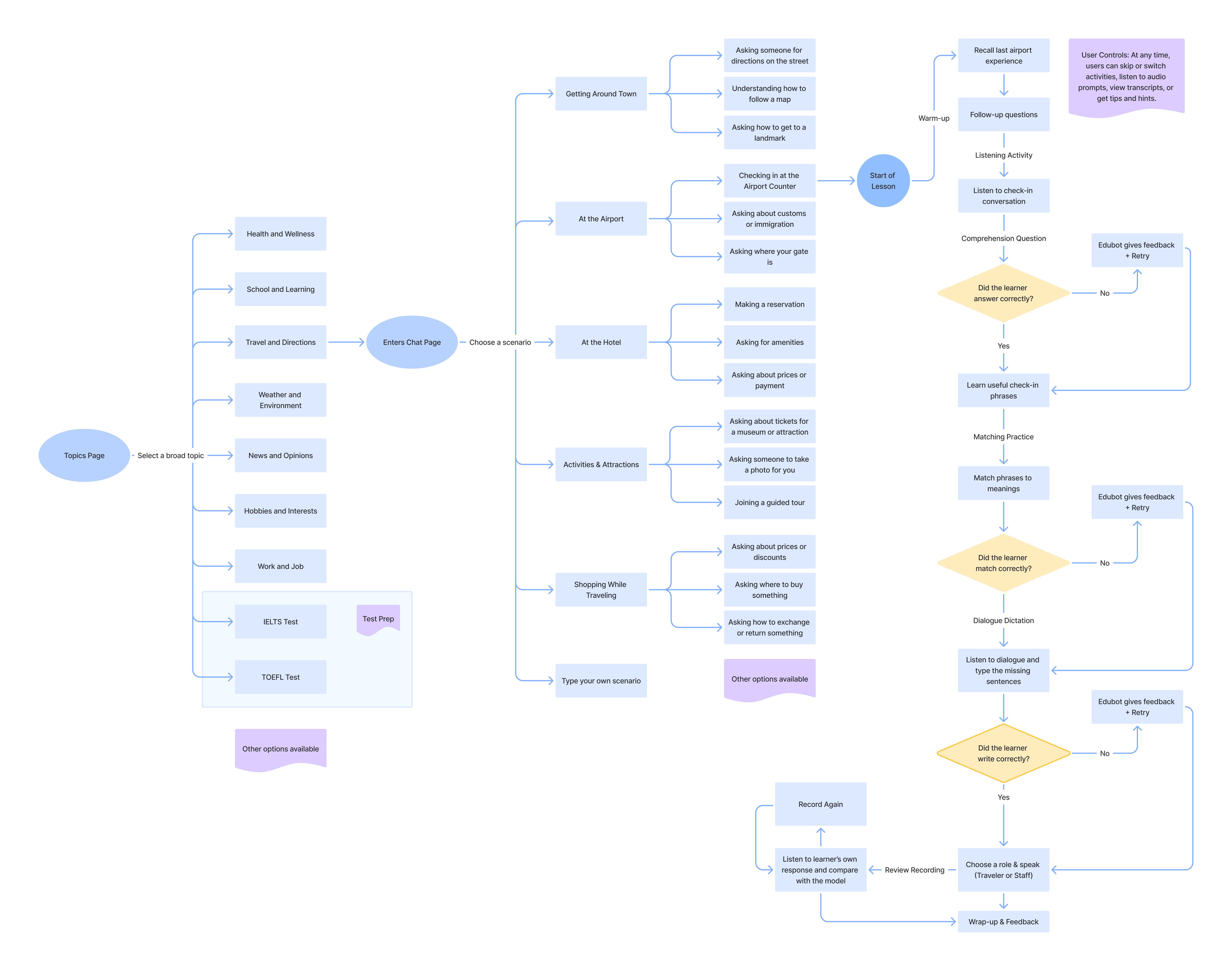 I led the design and iteration of conversation flows, using concept testing to shift from a fixed, linear structure to flexible practice paths aligned with learners’ goals.