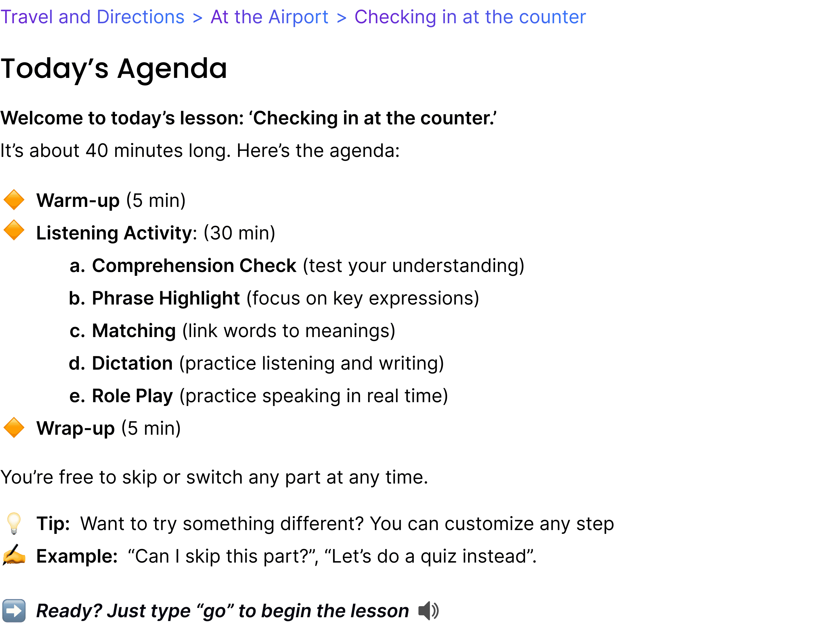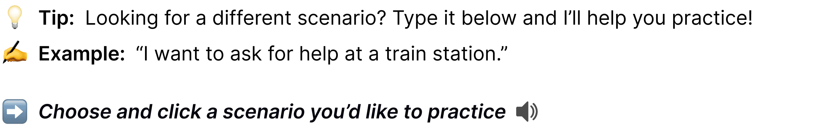 A personalized AI language tutor that lets learners choose real-life scenarios to practice through adaptive dialogue and varied learning activities, via typing or speaking.