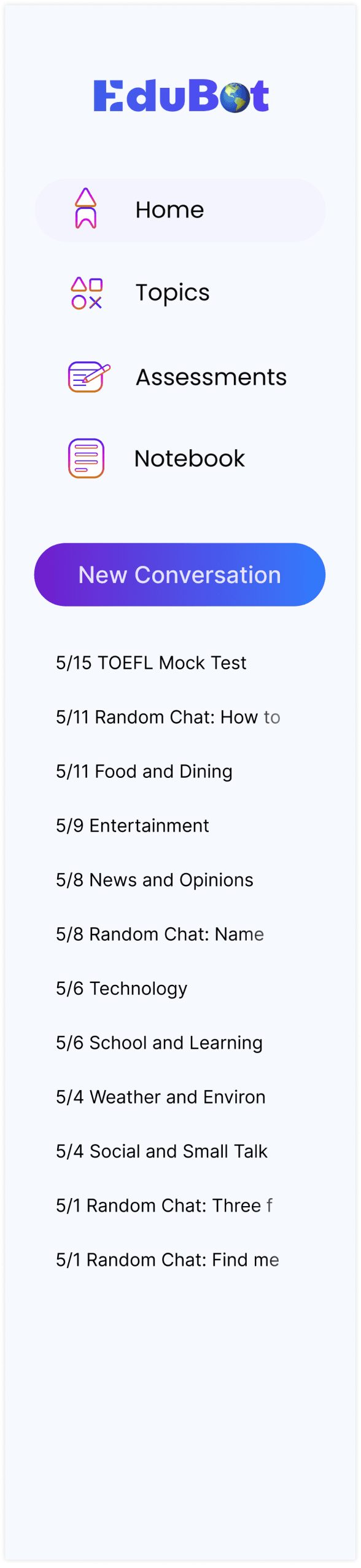 EduBot is designed for adult English learners who need flexible, low-pressure ways to practice English for real-life use and test preparation.