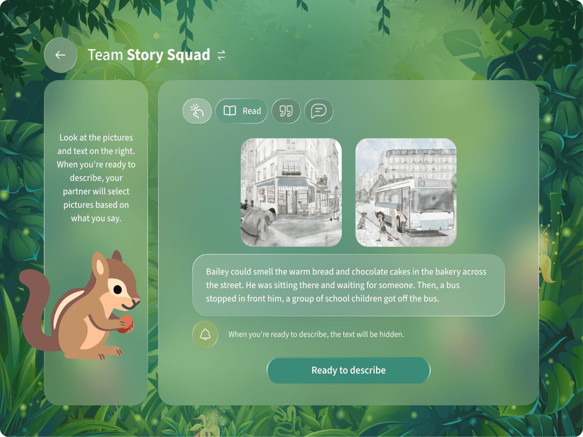 Reads a paragraph with images, describes it off-screen, and helps parent choose the correct images.