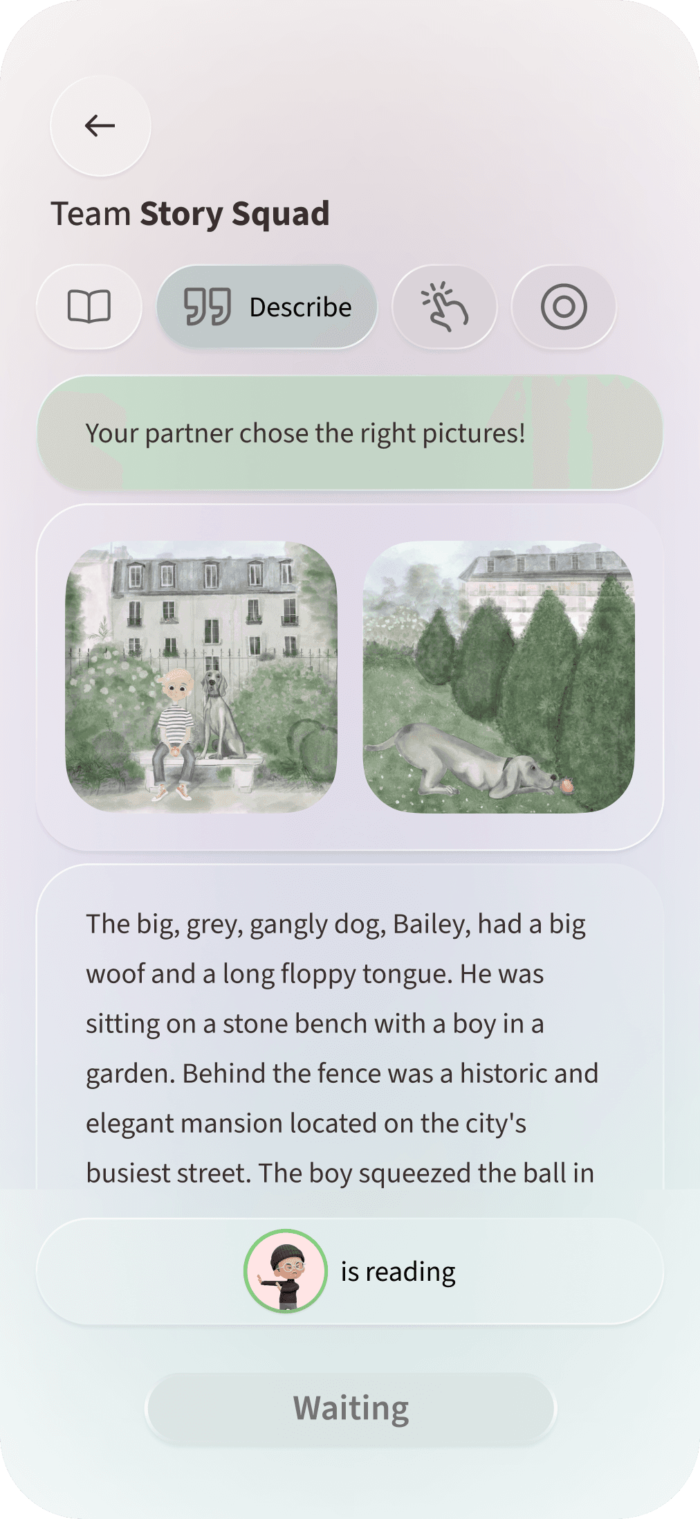 Waits while the parent reads, optionally plays a puzzle, then selects images based on the description and reviews the paragraph if correct.