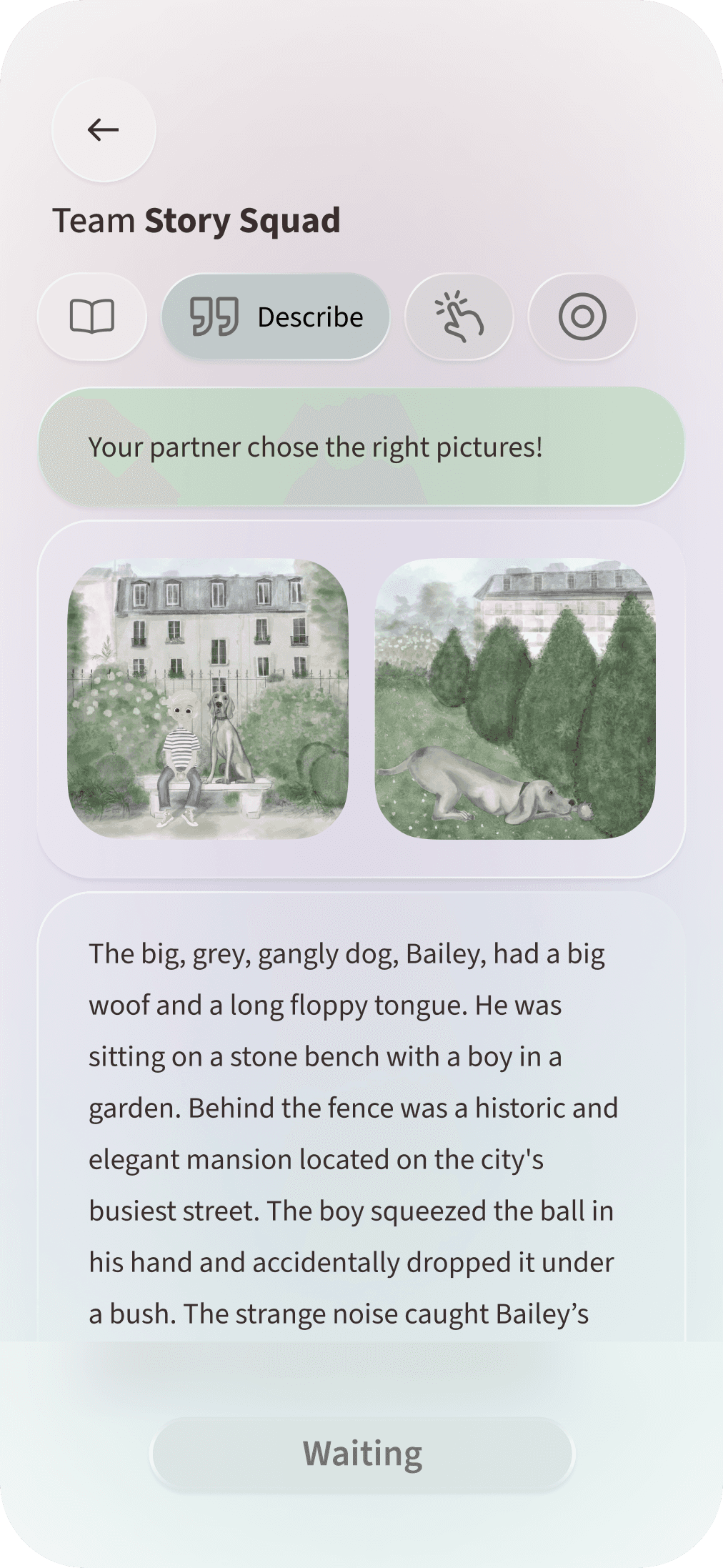 Two users on different devices take turns reading and describing content off-screen, guiding each other to select matching images through listening and interpretation, and ultimately co-creating a story together based on what they collect.