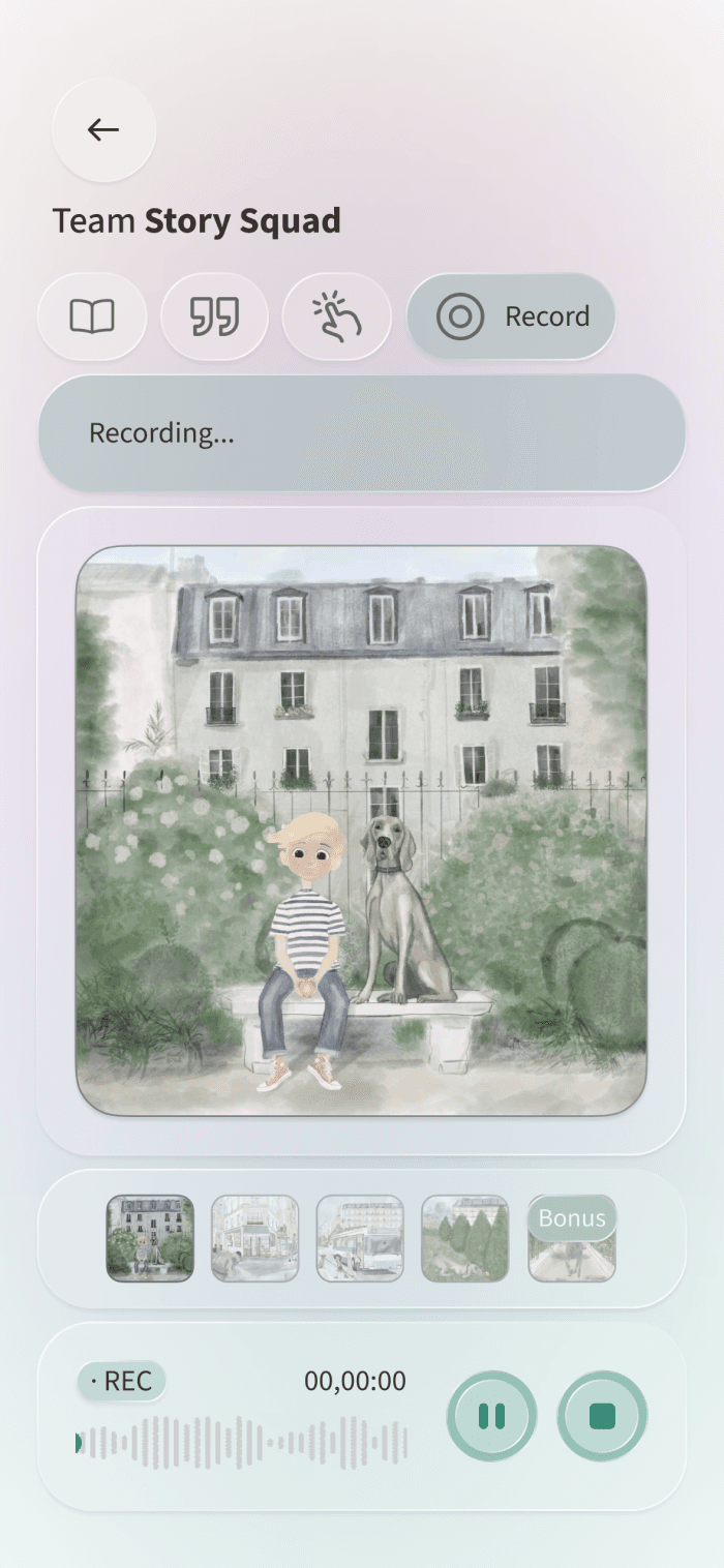 Parents record, receive feedback, and edit the story in-app. Once finalized and titled, both can review it in their shared story collection.